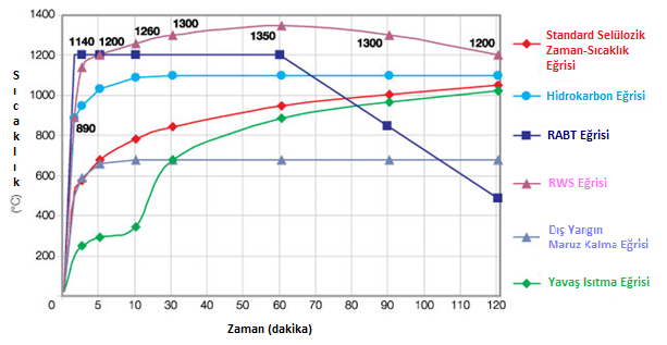Standart yangın testleri ISO 834, BS 476:part 20, DIN 4102, AS 1530 gibi çeşitli ulusal standartlarda tanımlanan selülozik zaman/sıcaklık eğrisine dayanarak yapılır. BS 7436 gibi çeşitli yangın test eğrileri olmasına rağmen, aşağıda tanımlanan eğri pratikte en düşük kullanılandır. Bu eğri genel yapı içerisinde kullanılan malzemelerin yanma hızını ve içeriğini baz alır.